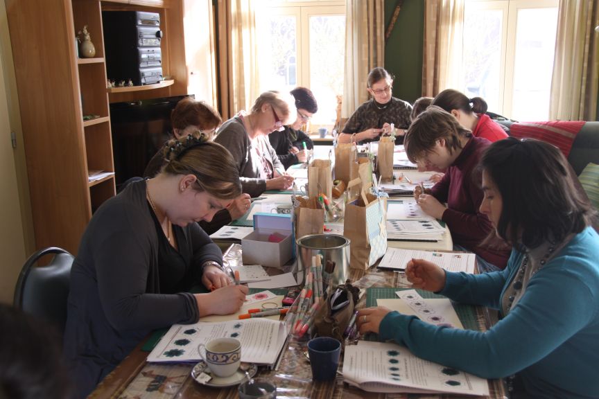 Tussen de uitleg door, hadden de deelnemers ook tijd om hun Copic Kleurenboek verder aan te vullen en te kleuren. De staaltjes cardstock werden ingekleefd, en een paar combinaties gezocht die erbij pasten. Ook combinaties voor haarkleur, huidskleur, bloemen ... konden aangevuld worden.